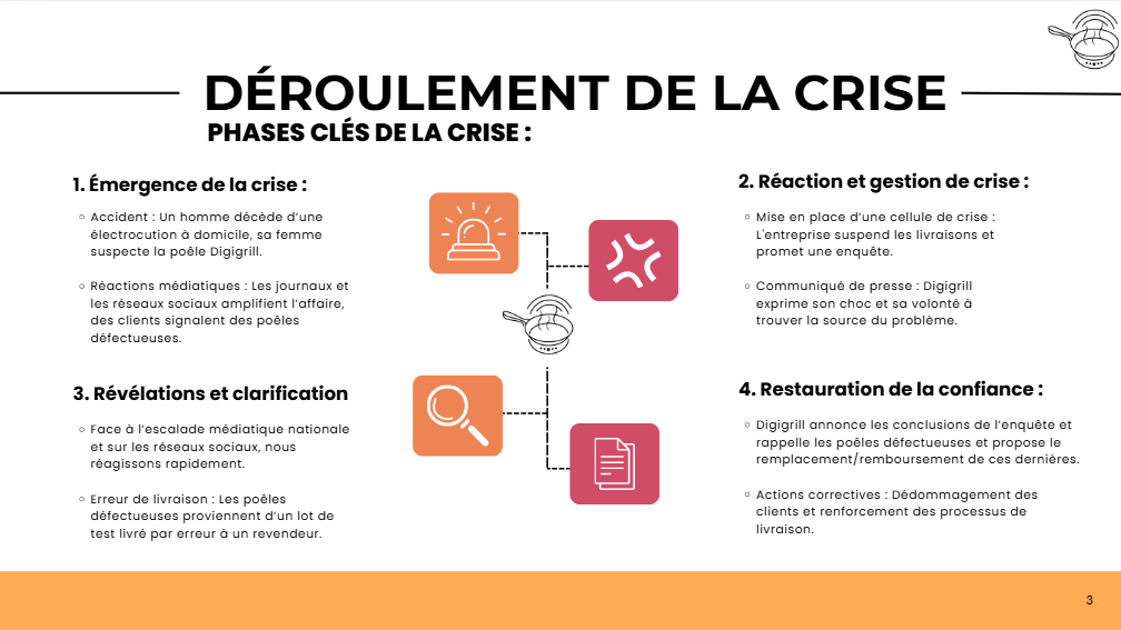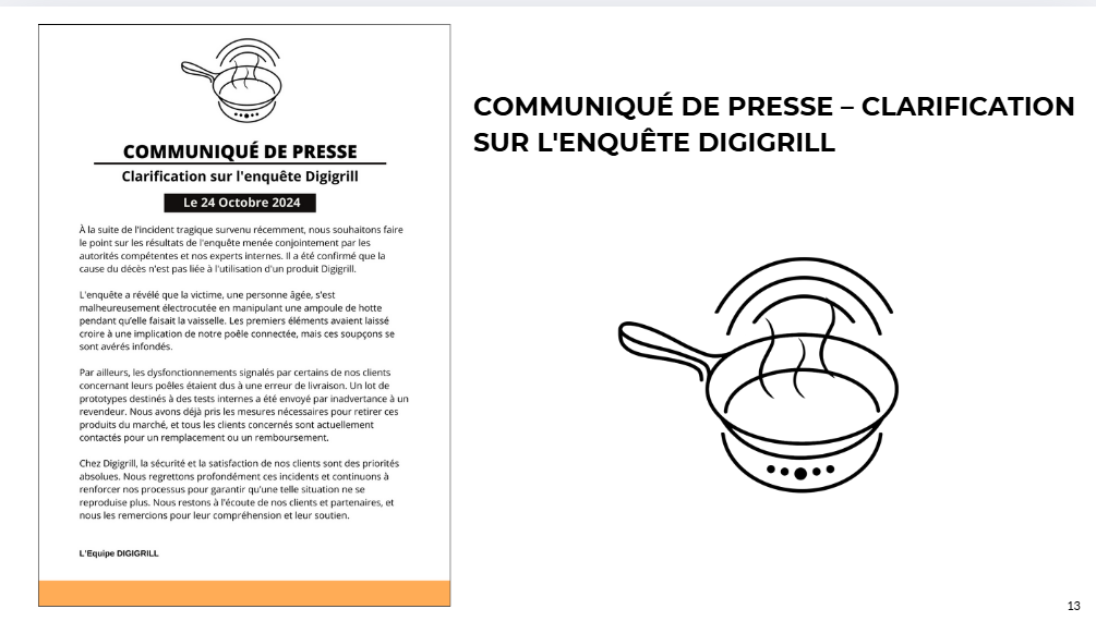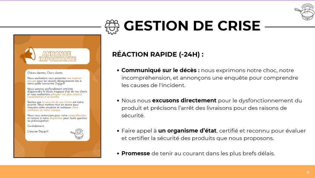 L’exercice incluait également une simulation de gestion de crise suite à un incident impliquant le produit. Nous avons analysé la situation, pris des décisions appropriées et mis en place une stratégie de communication de crise pour protéger l’image de l’entreprise et maintenir la confiance du public.