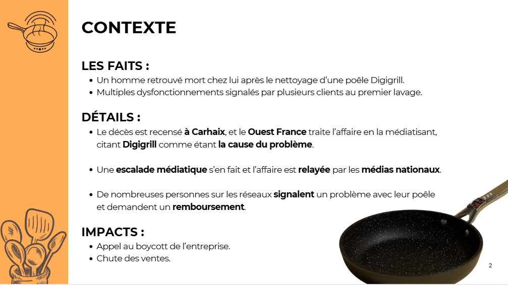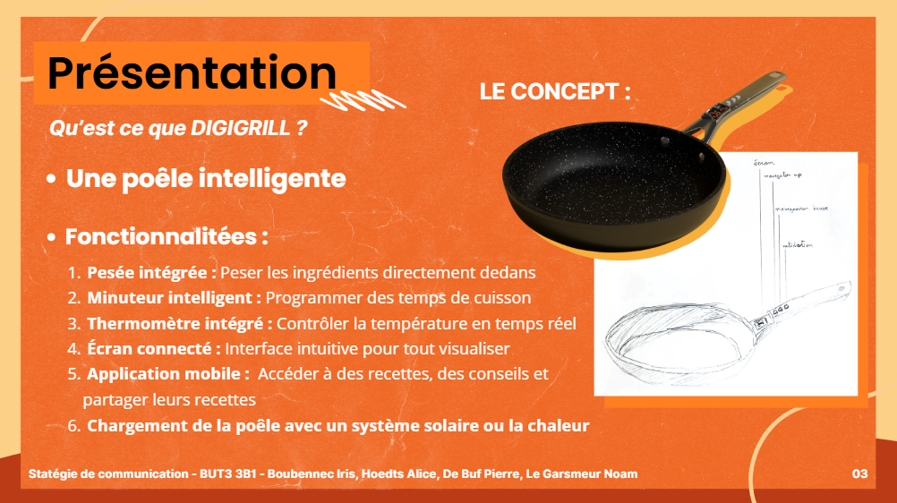 Dans le cadre d’un exercice, nous avons imaginé une entreprise de A à Z en développant un produit innovant : une poêle connectée multifonctionnelle. Ce projet nous a permis de concevoir l’identité de marque, d’élaborer un plan de communication stratégique, et de proposer des actions ciblées pour atteindre efficacement une audience définie.