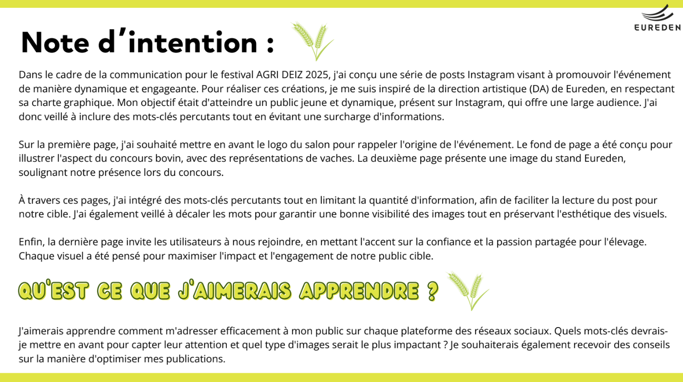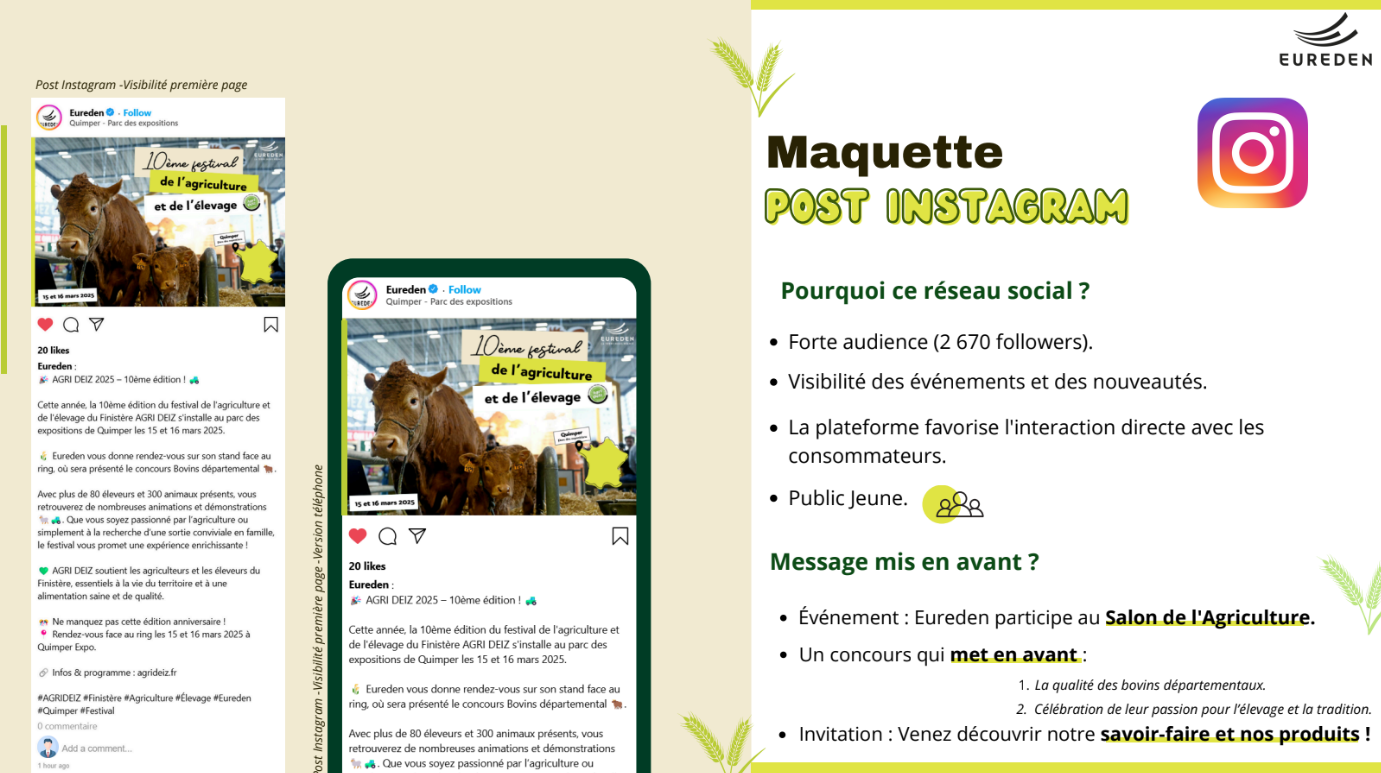 Lors de mon temps libre, j'ai eu l'idée de réaliser une proposition de post Instagram pour Eureden en collaboration avec le festival de l'argiculture et de l'élevage "AGRI DEIZ finistère".