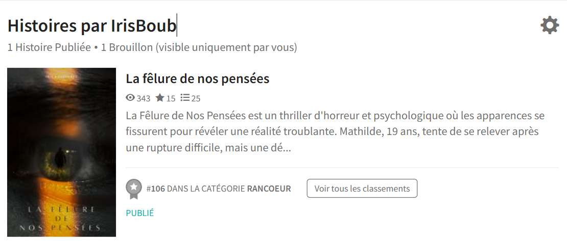 Je suis actuellement en train de réaliser un livre personnel sur Wattpad, mêlant thriller psychologique policier et bad romance. Ce projet me permet de développer une narration captivante, combinant suspense, enquêtes et relations complexes. Mon objectif est de proposer une histoire immersive et pleine de rebondissements pour tenir les lecteurs en haleine